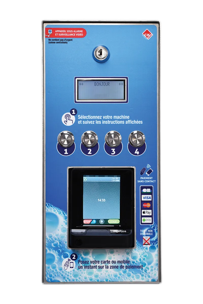 Une centrale de paiement (ou borne monétique) est un automate sécurisé qui permet au client de sélectionner un programme, payer et déclencher le service choisi : lavage portique, haute pression, aspirateur, gonfleur, lave-glace, distribution de jetons ou produits complémentaires.